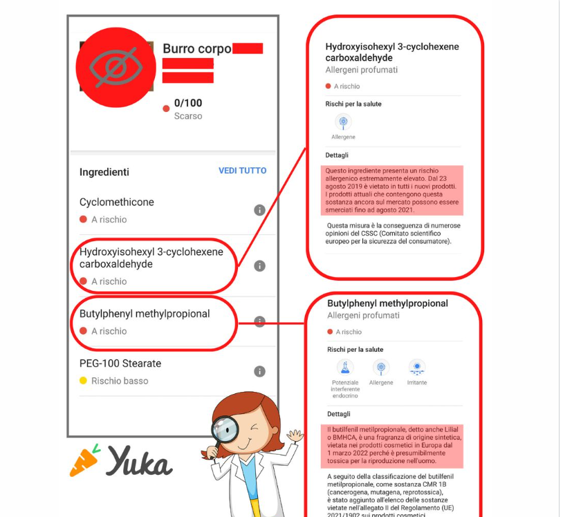 Yuka fornisce valutazioni basate su criteri come la composizione, presenza di sostanze leggermente, mediamente o fortemente sconsigliate (es. parabeni, siliconi, profumi sintetici, ecc) e la salute complessiva del prodotto.